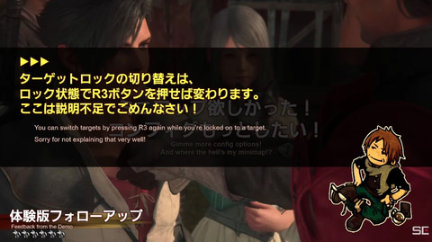 ほかにも、バトル中の敵のターゲットロックはR3ボタンで可能となることも紹介。ターゲットロックについてはゲーム内のガイドで説明されておらず、その補足説明が行なわれた。